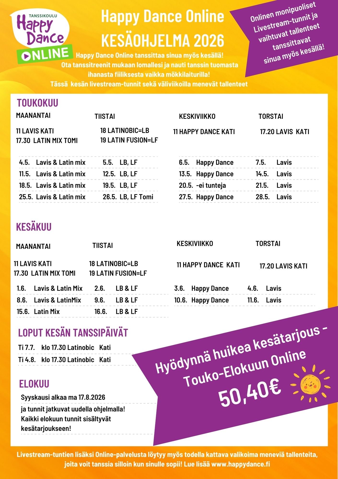 Livestream-tunnit ovat suoria lähetyksiä tanssikoululta Porin Vanhalta Kauppikselta! Opetus tapahtuu samaan aikaan sekä tanssikoulussa että verkossa, johon voit osallistua nettiyhteyden avulla mistä tahansa päin maailmaa! Happy Dance – verkkopalvelusta löydät myös Online-tanssitunteja, joita voit tanssia ja opiskella haluamanasi ajankohtana.